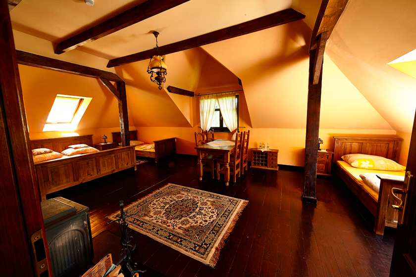 Pokoje wyposażone są w stylowe drewniane meble. W każdym pokoju znajduje się lukarna i okno dachowe. Wszystkie pokoje wyposażone są w łazienki z natryskiem. Na korytarzu znajduje się ogólnie dostępna lodówka. Zapewniamy Państwu kameralny i intymny wypoczynek.